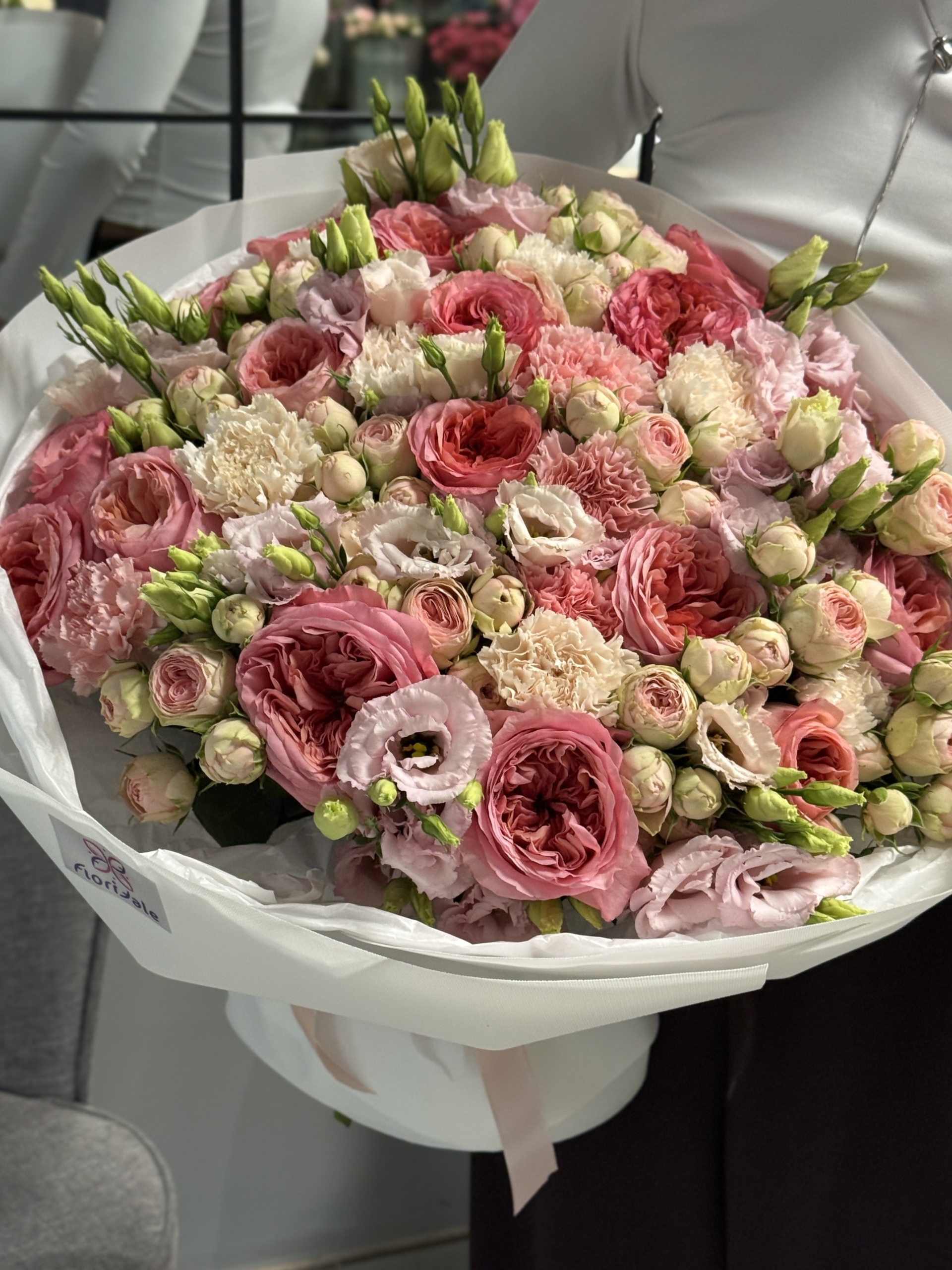 Composition: peony roses, spray roses, dianthuses, lisianthuses